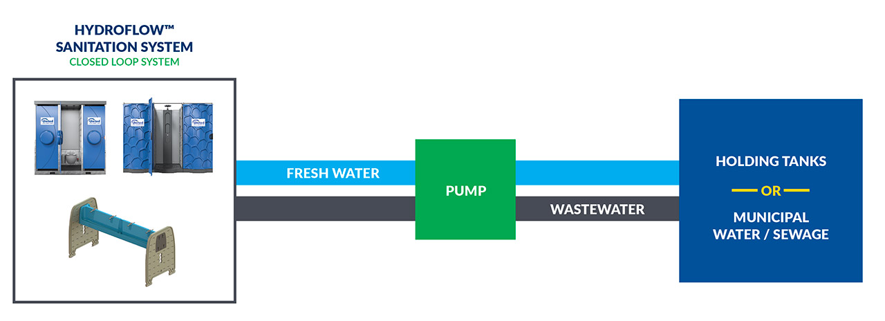 - The Hydroflow restrooms are set up in straight lines and 90 degree turns. The system can be connected to external water/waste tanks or city water/sewer depending on site and permits. Clients must obtain all permits when using city water/sewer