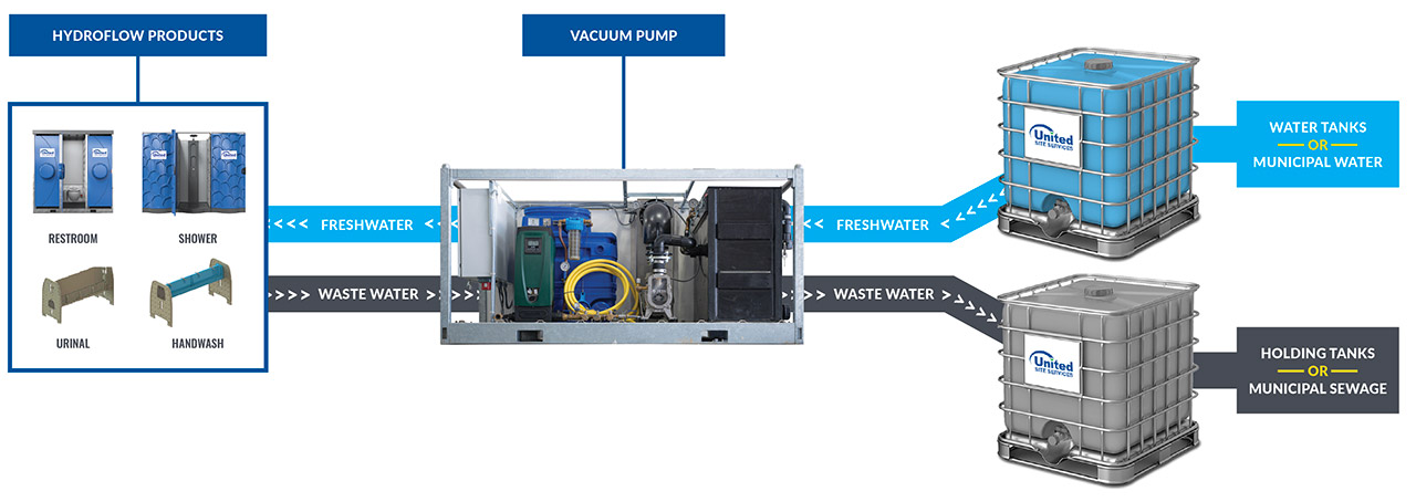 Elevate your portable restroom experience with Hydroflow restrooms, showers, sinks and urinals from United Site Services. This modular system is connected to a mobile pump and waste evacuation vacuum system making this system easy to transport, easy to set up and can be configured in a wide variety of combinations to fit your needs. Plus, it saves on fresh water while providing the cleanest experience for your guests. It’s never been easier to provide an elevated sanitation experience for a crowd. With this new technology you will want to be sure to get your Hydroflow™ Sanitation System rental prices now to ensure delivery when needed.