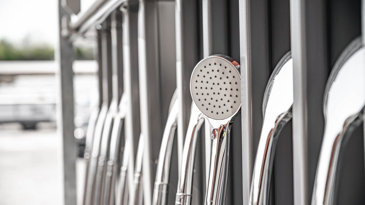 High-capacity shower system for large events and sites. Water distribution functionality provides hot and cold water to all showers.